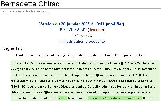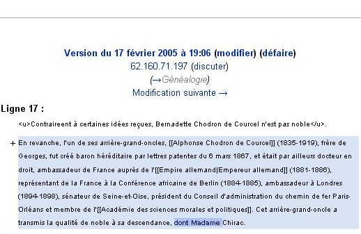 Mais l’Intérieur est loin d’être le seul à avoir piraté Wikipedia, et le ministère de la Culture s’est lui aussi vu banni de Wikipedia, pendant 6 mois, suite aux vandalismes répétés de la page consacrée au Mariage dans la tradition chrétienne effectué depuis les ordinateurs du ministère. Au Minefi, un crâne d’oeuf effaça quant à lui d’un clic de souris le passage consacré au HLM de luxe que louait, à prix d’ami et en violation de la règle édictée par Jean-Pierre Raffarin, Jean-François Copé, alors ministre délégué au Budget. Au ministère de l’Education, quelqu’un aseptisa les démêlés judiciaires de Xavier Darcos, lorsque, jeune professeur de lettres en 1982, il avait fait plancher ses élèves sur un sujet très voisin de celui qui fut proposé au bac trois jours plus tard. Le mammouth sait aussi faire dans l’humour : c’est en effet à l’un de ses fonctionnaires que l’on doit la création de la fiche consacrée à Trifouillis-les-oies, ainsi qu’à son jumelage avec “Perpète-les-Andouillettes”… Plus fort encore : à l’Elysée, quelqu’un chercha à mettre en avant la noblesse de Bernadette Chirac (née Chodron de Courcel) en effaçant ce pour quoi elle ne peut précisément pas revendiquer de titre de noblesse.