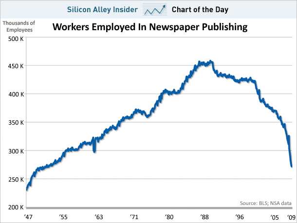 par Cécile Dehesdin sur Slate.fr sans langue de bois et sans tabous ! Conseils que pourrait illustrer la courbe ci-après, repérée par Rue89 (source : business insider, la chute de l’emploi dans les journaux américains depuis 15 ans)