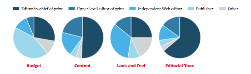 Menée par sondage (auquel répondirent 665 journalistes ou responsables de rédaction), cette étude ne concerne pas les quotidiens, mais exclusivement, comme son titre l’indique, les « Magazines and Their Web Sites » américains [l'enquête ici - Pdf - payant: 25 $].