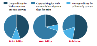Certes, on peut se féliciter que 89% des sites (de magazine) étudiés aient adopté un système d’édition [a contrario, 11% n'en ont pas], mais si 41% ont la même procédure d’édition pour le papier et le web, près de la moitié (48%) des groupes de presse a adopté un système moins rigoureux pour le web que pour le papier.