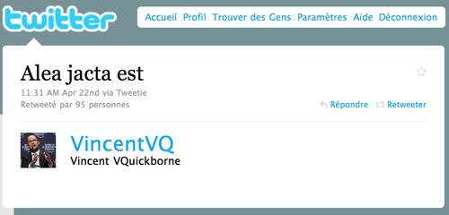 Voici le tweet envoyé à 11h31 ce jeudi 22 avril par Vincent Van Quickenborne (@VincentVQ) à l’issue de la réunion de l’Open-VLD. Le président de son parti, Alexander De Croo (@alexanderdecroo) prendra quelques minutes plus tard la parole devant les journalistes pour annoncer que son parti sortait du gouvernement, provoquant sa chute et forçant le premier Ministre Yves Leterme (@YLeterme) à remettre sa démission au Roi.