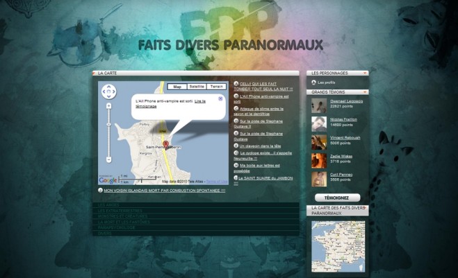 Le projet Faits Divers Paranormaux porté par Orange exploite avec brio les ressorts de la fiction transmedia : s’appuyant sur une série télévisée diffusée tous les soirs à 20h30 sur Orange Ciné Choc, l’univers narratif se déploie en ligne (quelques semaines avant diffusion avec une présence sur un blog et les réseaux sociaux) mais s’enrichit surtout des contributions des internautes avec la mise en place d’un véritable ARG : « les internautes vont avoir l’occasion de se changer en véritables enquêteurs du paranormal[…] Ils devront résoudre des énigmes au rythme d’une question par jour en menant leurs investigations sur internet, mais aussi par téléphone ou dans la vie réelle », nous explique Guillaume Ladvie, community manager sur le projet. Une véritable expérience interactive, donc.