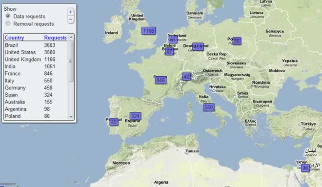 En effet, sur http://www.google.com/governmentrequests/, on peut observer l’activité offensive des États et comparer le nombre et la nature de leurs requêtes interventionnistes vis-à -vis de Google et de ses utilisateurs.
