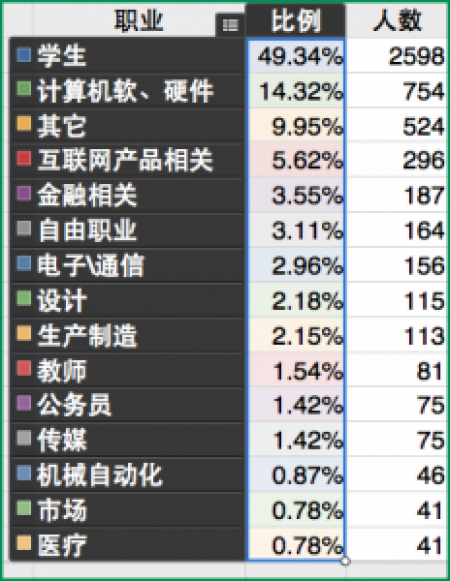 La plupart sont des étudiants (49.34%) suivis par des personnes travaillant dans l’informatique et l’Internet (environ 20%) puis le secteur de la finance (3.55%) et des indépendants (3.11%).