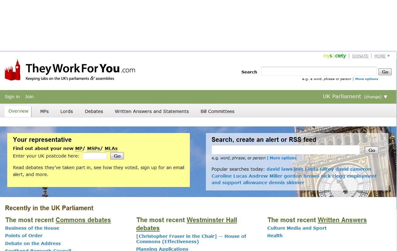TheyWorkForYou et GovTrack.us ont tous les deux été lancés en 2004, par des groupes de bénévoles qui voulaient faciliter le suivi de l’activité politique des parlementaires. Tous deux s’appuient sur des données déjà publiées sur des sites officiels tels que le Hansard au Royaume-Uni ou celui de la Library of Congress aux Etats-Unis, pour les présenter dans un format plus accessible, avec un moteur de recherche, et un espace de débat.