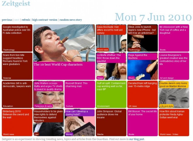 L’internaute peut aussi être mis à contribution dans le design de l’information via les algorithmes sociaux. Le Guardian a ainsi crée une page d’accueil alternative, appelée Zeigeist, où les articles sont organisés selon l’activité sociale qu’ils ont générée.