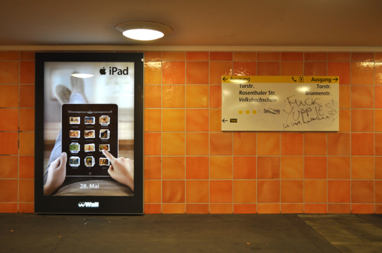 À l’occasion de la sortie internationale de l’iPad, le 28 mai dernier, des Berlinois ont réagi en réalisant cet adbusting. Installée à la station de métro Rosenthaler Platz, cette version publicitaire NSFW du dernier joujou d’Apple associe photos explicites et légendes très cucul (« Promenade au bord de la mer », « Fête de Paques », etc.) via@DominicKennedy