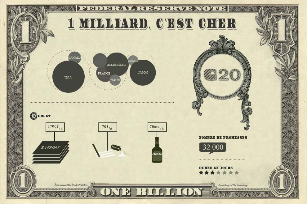 Un sommet coûte en général plusieurs centaines de millions d’euros. Le record a été atteint cette année, avec un budgetsupérieur à un milliard de dollars pour un double sommet. Ce qui signifie, si l’on a un peu de mauvaise foi et que l’on considère que les déclarations sont imprimées avec 400 mots par page sur du papier bristol, que les sommets du G8 et du G20 coûtent entre 10 000 et 2 millions de dollars le gramme. Bien plus cher que la coke.