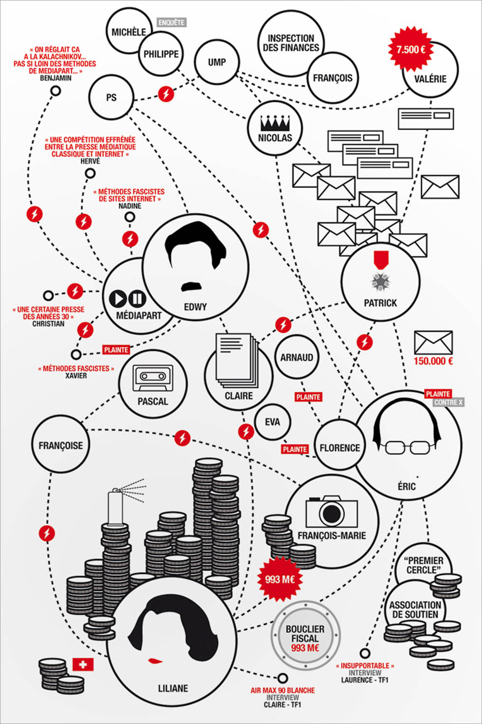 On avait la mindmap (pas très jolie, mais interactive) de Mediapart.