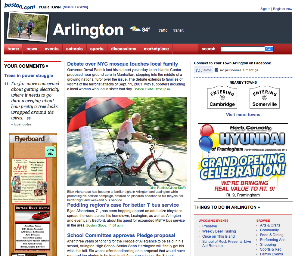 - les pages locales du Boston Globe, qui sont en fait un mini site. Le Boston Globe a créé en 2008 une rubrique Your Town, qui regroupe aujourd’hui 31 de ces sites. Très rapidement, 9 nouvelles villes devraient être couvertes par ce réseau.