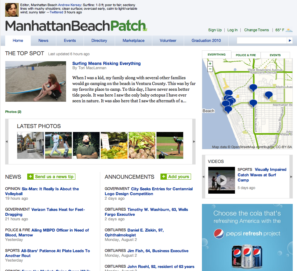 Bref, le modèle économique de Patch.com semble bien fragile, d’autant que la fréquentation ne semble pas encore au rendez-vous. Selon Nielsen, en juin 2010, la fréquentation de la totalité des sites Patch.com était de 210.000 visiteurs uniques par mois. Des chiffres à revoir lorsque le réseau sera déployé. Néanmoins, il faut espérer qu’existent d’autres ressources que la seule publicité, sinon il repose sur l’énergie et un investissement personnel de chacun des journalistes qui anime ces micro-sites. Sur la durée, ce système low cost cela ne semble pas tenable. Comme le dit plus crûment Mike Fourcher « le modèle économique d’AOL – Patch n’a pas de sens » [AOL's Patch revenue model make no sense].