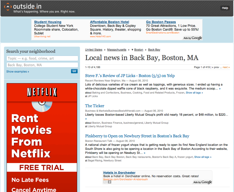 Le site Outside.in est un agrégateur de contenus produits par d’autres, qu’il s’agisse des sites de journaux locaux (et donc ceux de concurrents comme Your Town ou équivalents), de télévisions locales, de blogueurs locaux, d’informations municipales, d’informations immobilières mais aussi de réseaux sociaux ou de Twitter. D’après son Pdg, Mark Josephson, Outside.in agrège plus de 40.000 sources différentes. Ces contenus agrégés sont ensuite redistribués localement, de manière automatique. Un moyen d’être réellement hyperlocal, puisque Outside.in affirme alimenter plus de 57.000 sites.