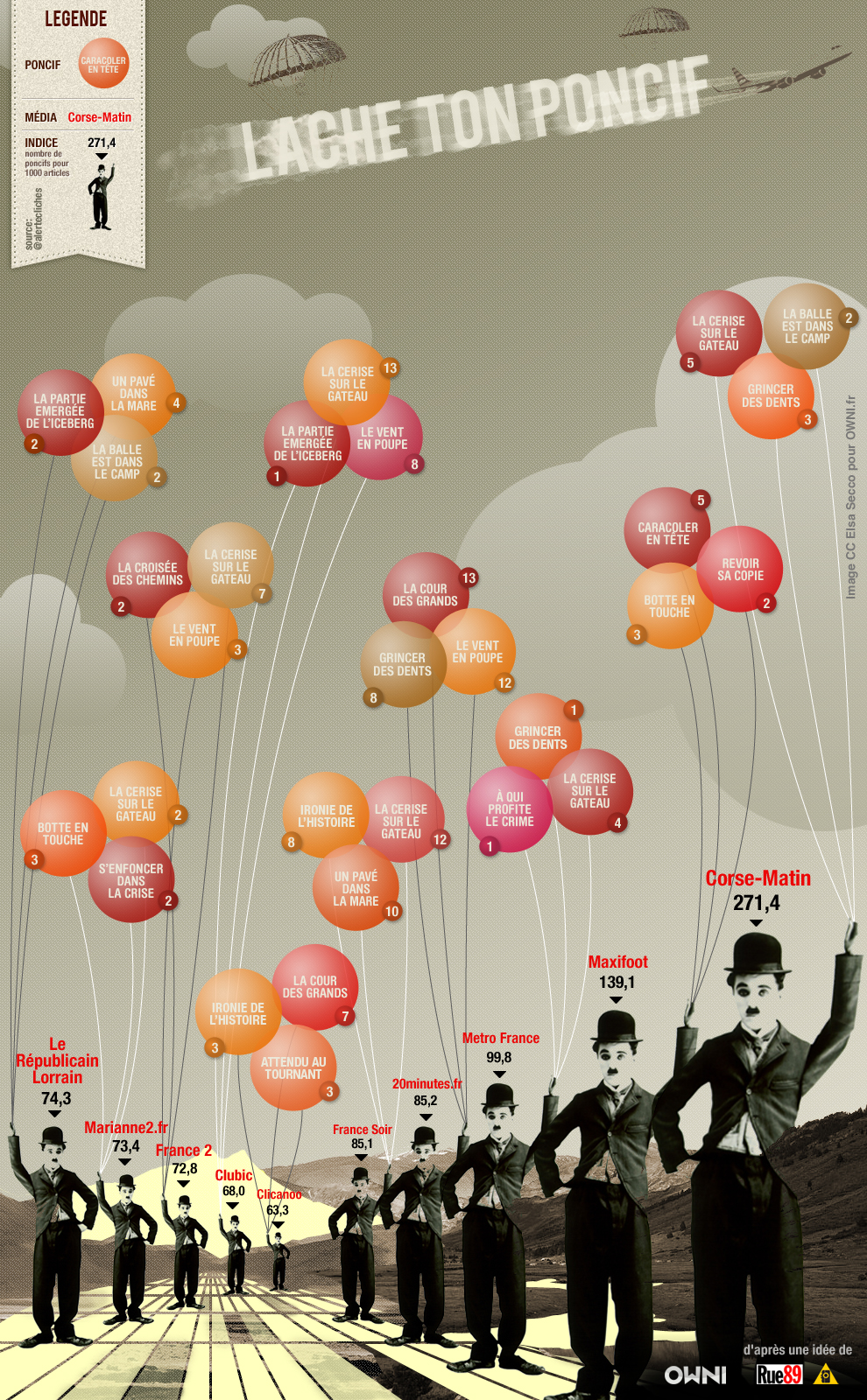 L’article de Yann Guégan nous ayant beaucoup amusé en cette période creuse du mois d’août (qui a parlé de #jourchiant ?), Elsa Secco s’est lancée dans la production d’un magnifique poster, épaulée par Eliott Lepers. Le poster recense les 10 médias dont l’indice “alertecliche” (nombre de poncifs pour 1000 articles d’août 2009 à août 2010) est le plus élevé, et indique les trois poncifs préférés de ces sites ainsi que le nombre d’articles dans lesquels ils apparaissent. Le tout en Creative Commons, n’hésitez pas à partager.