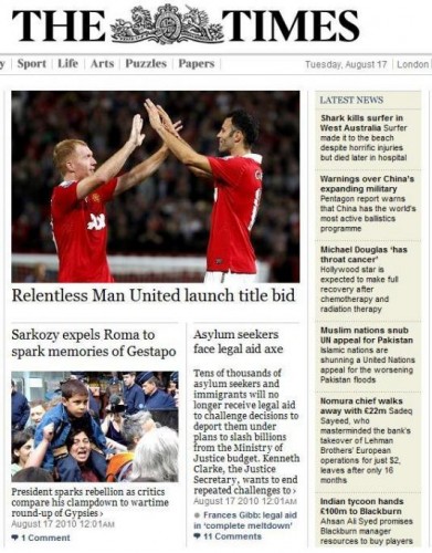 Tout comme l’éditorial du New York Times dénonçant la politique «xénophobe» du gouvernement français, le titre de Une du Times mentionnant les «souvenirs de la Gestapo» à propos des évacuations de Roms, n’est pas passé inaperçu (voir ci-contre). Après Stéphane Hessel ou Michel Rocard évoquant Vichy ou les nazis, le rappel des «rafles pendant la guerre» par le député UMP Jean-Pierre Grand montrait que le vénérable journal britannique n’était pas le seul à avoir la mémoire chatouillée par certains rapprochements.