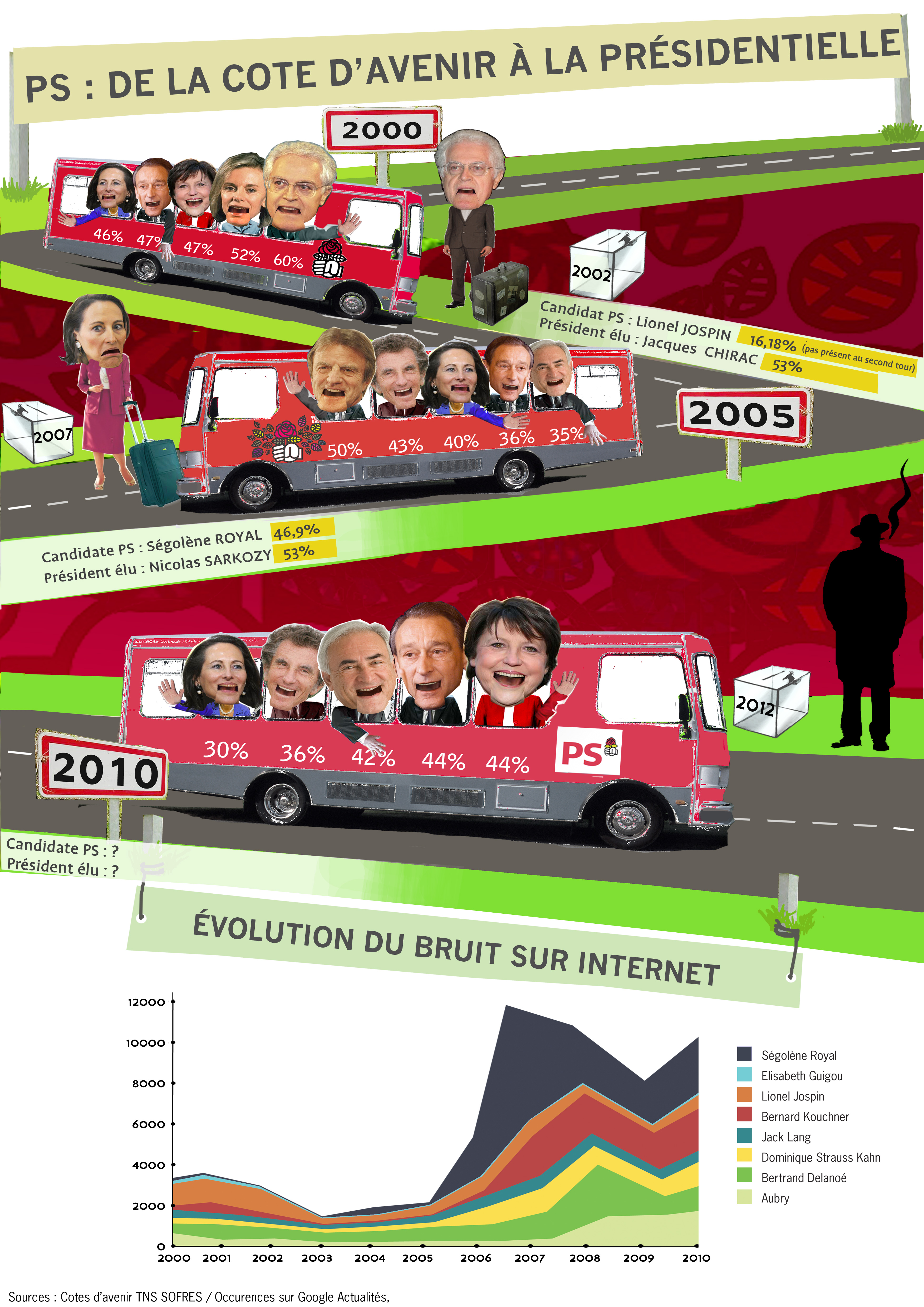 Cette infographie rappelle qu’à la question: “Pour chacune des personnalités suivantes, souhaitez-vous qu’elle ait davantage d’influence dans la vie politique française?”, ceux qui ont représenté le PS à l’élection suprême n’étaient pas forcément les plus plébiscités par les sondés à deux ans du scrutin. C’est le cas pour Ségolène Royal, qui était en 2005 en troisième place, celle qu’occupe Dominique Strauss-Kahn aujourd’hui.
