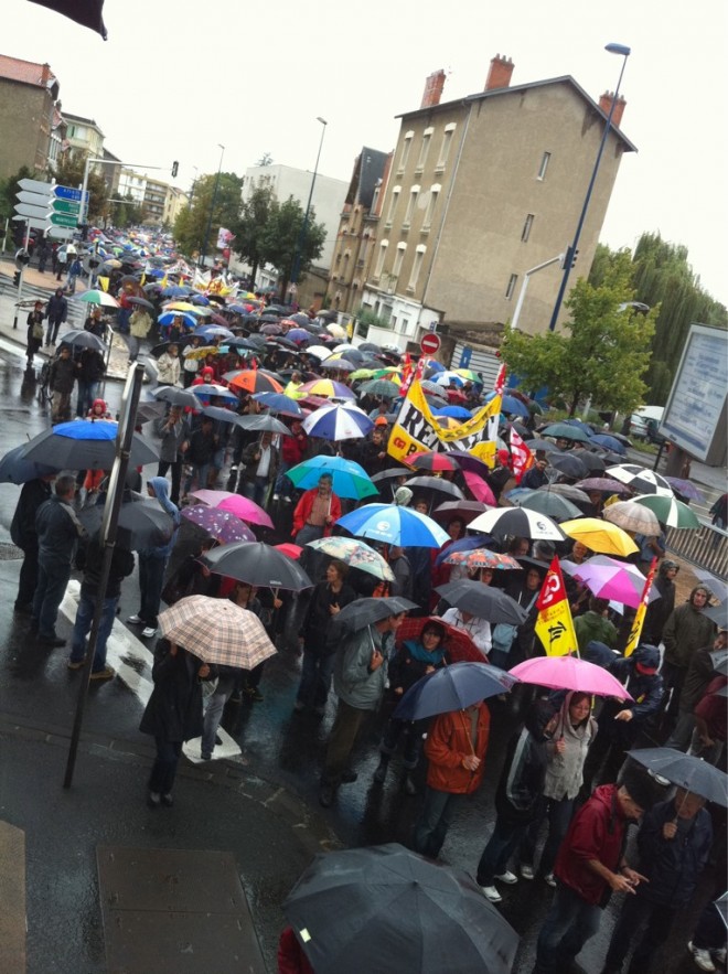 [11h57] A Clermont Ferrand : mouillés, mais mobilisés : les syndicats auraient dénombré 20 000 personnes selon @Cecile_Jandau, journaliste au quotidien de la ville. Une photo du cortège d’ombrelles sur le boulevard Lavoisier: