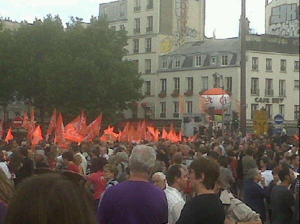 Beaucoup de monde place de la République, les centrales syndicales sont fortement représentées. En tête du cortège, Bernard Thibaut (CGT) et François Chérèque (CFDT) se prêtent au jeu des photos: