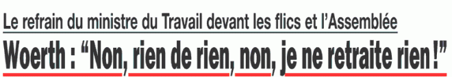 Malgré des tentatives désespérés de balayer les questions étonnamment insistantes de Laurence Ferrari, Éric Woerth n’a pu éviter d’évoquer l’affaire Bettencourt, « une campagne » qui, depuis trois mois, « livre [son] nom en pâture ». Rappelant le soutien que lui ont témoigné ce jour les députés UMP, le Président et la majorité, il a fixé l’animatrice, s’armant d’un ton agacé : « je vous le dis dans les yeux : je n’ai jamais menti sur rien ». Une déclaration qui devra être mise à l’épreuve de cette interview au cours de laquelle il a soutenu être toujours en charge de la réforme des retraites. Nicolas Sarkozy seul pourra lui donner raison ou tort. L’opposition et les syndicats ayant cessé les attaques sur le dossier Bettencourt pour mettre en avant le projet goûteront en tout cas les mots de M. Woerth : « toute démission serait un avis de culpabilité ». Et de quoi un limogeage serait-il un aveu ? D’incompétence ? Suite au prochain épisode. Car, à n’en pas douter, l’affrontement fait que commencer.
