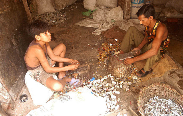 Des indiens récupèrent certaines parties de vieux condensateurs à l'aide d'une machette