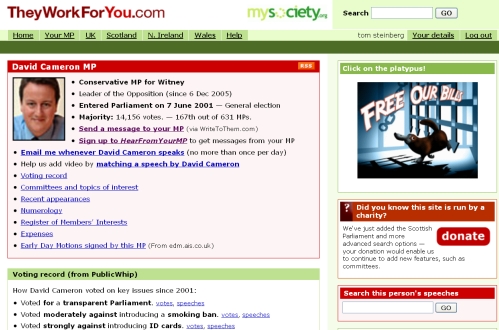 Our first stop is the United Kingdom, where They Work for You is enabling citizens to access data about their representatives to the UK Parliament, Scottish Parliament, the Northern Ireland Assembly and the Welsh Assembly. They Work for You was originally developed by a group of volunteers. With the support of UK Citizens Online Democracy and MySociety it has expanded to allow others to use its data via an open API. Based on a simple post code search, I was able to find my local MP and read his bio, recent speeches and appearances, and also — more importantly — his expenses, sponsorships, and additional income.