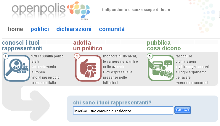 In Italy, Openpolis is the site to check out. With a community of more than 13,000 members and various content management options (tagging, graphing, etc.), it allows users to find their local representatives, ‘adopt’ them, follow their activities and contribute to an online database by uploading updates on the chosen representative. Openpolis’ sub-site Open Parlamento is a great real-time monitor of parliament activities, including this impressive visualisation on voting sessions and this profile of Silvio Berlusconi.