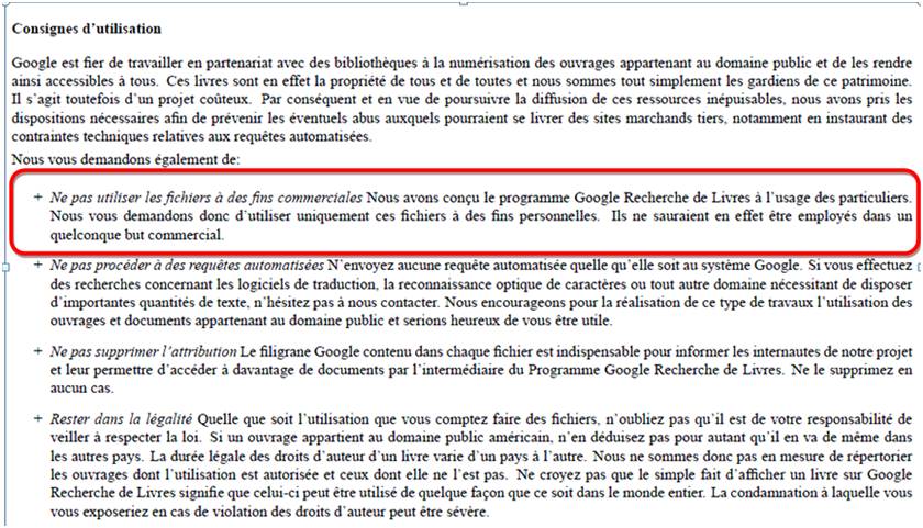 Avant même d’avoir à juger si les revendications de Kessinger Publishing sur les ouvrages du domaine public étaient fondées, Google aurait pu répliquer en accusant l’éditeur d’avoir violé l’exclusivité commerciale qu’il revendique sur les ouvrages numérisés par ses soins. Car Kessinger Publishing fait bien commerce des ouvrages récupérés et réimprimés, par le biais d’Amazon. Cette exclusivité, Google y tient pourtant… C’est l’une des restrictions fortes que Google impose à ses bibliothèques partenaires, en leur interdisant pendant une durée variable de faire elle-même un usage commercial des copies qui leur sont remises ou de les transférer à une partenaire susceptible d’en faire un usage commercial.