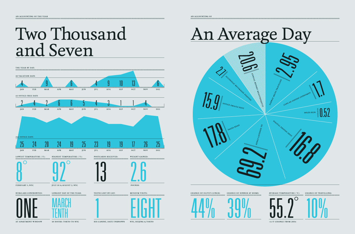 Plus j’y pense et plus je crois que la curiosité y est pour beaucoup dans cette aventure. Je me demande à quoi une année va ressembler à travers la focale que j’aurais choisie, c’est-à-dire comment je l’ai ressentie et comment elle a été perçue par mon entourage. Je suis curieux de voir les traits qu’elle va prendre une fois que j’aurai résumé ses divers aspects en nombres ! Je regarde l’ensemble de mes transports par exemple et je compte le nombre de kilomètres que j’ai parcouru en avion durant ces 365 jours. Cette année je m’intéresse attentivement au temps que je passe dans différents lieux, et avec qui je m’y rends. J’ai aussi deux ou trois autres idées mais vous verrez cela bien assez tôt ! J’ai besoin que cette recherche reste fraiche et excitante. Il faut que l’Annual Report reste un projet neuf chaque année. C’est aussi mon laboratoire visuel. Je peux y essayer de nouvelles formes et de nouvelles manières d’explorer les données, sans qu’un client me dise que cela lui déplait ou que l’aventure ne l’intéresse pas. C’est très libérateur et productif pour ma pratique.
