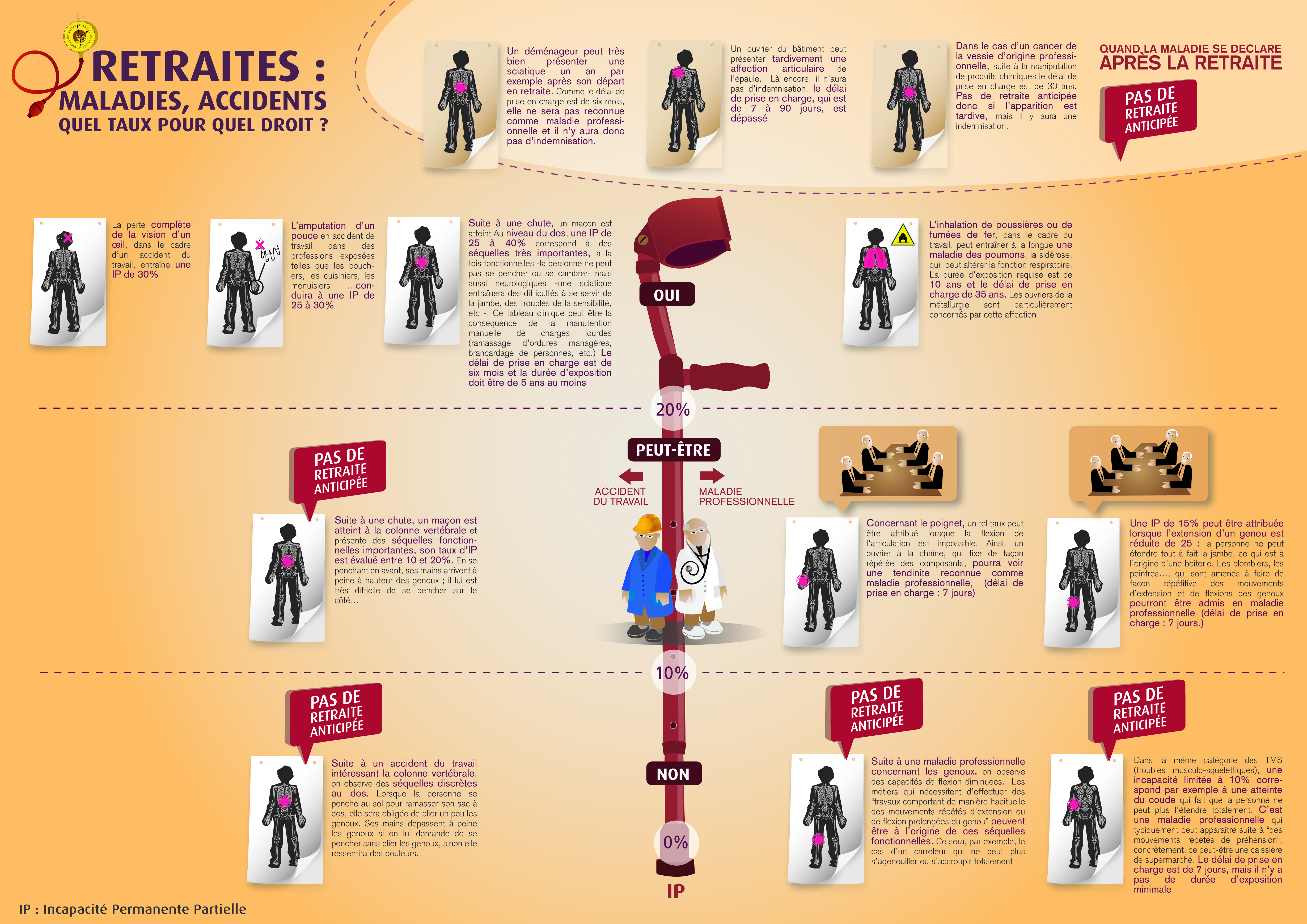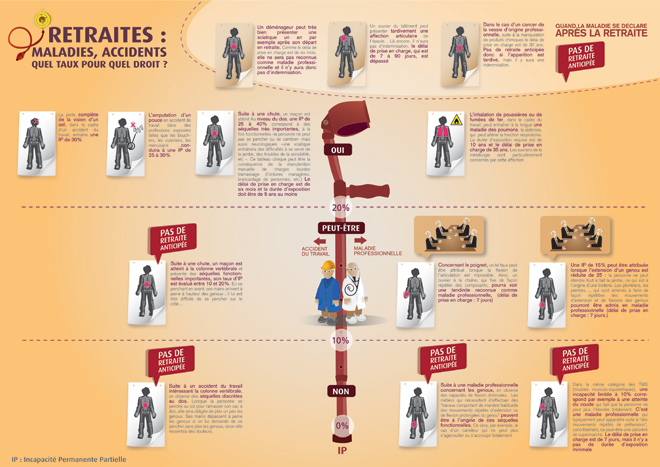 Avec l’aide du docteur Xavier Bourhis, médecin-conseil à l’Assurance Maladie, OWNI a essayé de vous montrer de façon un peu plus concrète à quoi correspondent ces tableaux très techniques, en vous donnant des exemples d’IP selon les seuils-clés de la réforme. Nous avons aussi abordé le cas des pathologies qui peuvent se déclarer après le départ à la retraite. Il arrive en effet qu’un salarié ne présente aucune affection durant son activité professionnelle et que les premiers symptômes apparaissent à un âge plus avancé, parfois « du jour au lendemain », nous a expliqué le Dr Bourhis.