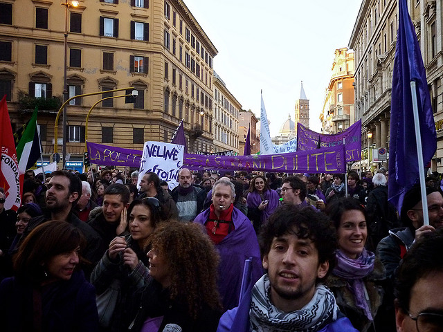 Vers 14h30, le cortège s’ébranle dans une atmosphère plutôt joyeuse. « Berlusconi, espèce de salaud » ou « La Mafia, hors de l’Etat », scande une foule où se mélangent les âges, à travers les rues de la capitale. Aux banderoles violettes venues de toute la péninsule, – via 300 bus, d’après les organisateurs – se joignent celles de plusieurs partis. « On les voit trop », soupire une Turinoise, vêtue de violet.