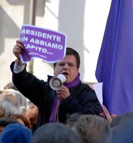 Particulièrement présents, le bleu et le blanc de l’Italia dei valori (IDV parti fondé par un ex magistrat, Antonio di Pietro, en pointe dans le combat contre la corruption du monde politique) colorent la foule en marge de la majorité violette. Quelques hommes politiques tel que Nichi Vendola, président de la région des Pouilles, et figure montante de l’opposition, plutôt bien acueillis par les manifestants.