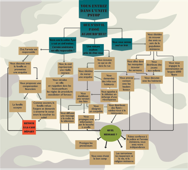 Vers la fin de la guerre, l’influence se fait à un niveau individuel. Les PSYOP se tournent vers les conversations directes avec la population, comme le recommande ce rapport qui fait suite à un attentat. Accompagnés de leurs interprètes, quand ils ne maîtrisent pas eux-mêmes l’arabe, ils diffusent leur message, toujours guidés par des ‘talking points’ prédéfinis.