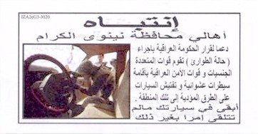 Citoyens de la province de Ninewah pour soutenir l’état d’urgence décrété par le gouvernement irakien, les forces de sécurité irakiennes et les forces multi-nationales ont installé des check point à divers endroits et effectuent des fouilles de véhicules sur les routes de la région. Ne sortez pas de votre véhicule sauf ordre contraire.