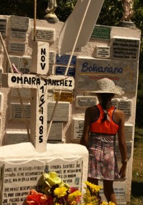 La transfiguration s’illustre, dans le cas d’Omaira Sanchez2 par une ascension spirituelle. Cette figure du drame colombien, est en effet en passe d’accéder au statut de martyre. Étonnante trajectoire symbolique de cette petite fille, qui fait aujourd’hui l’objet d’un culte et d’un pèlerinage. Sanctifiée, sa mémoire rassemble3, une semaine durant, des foules dans la ville d’Armero, théâtre de la tragédie colombienne.