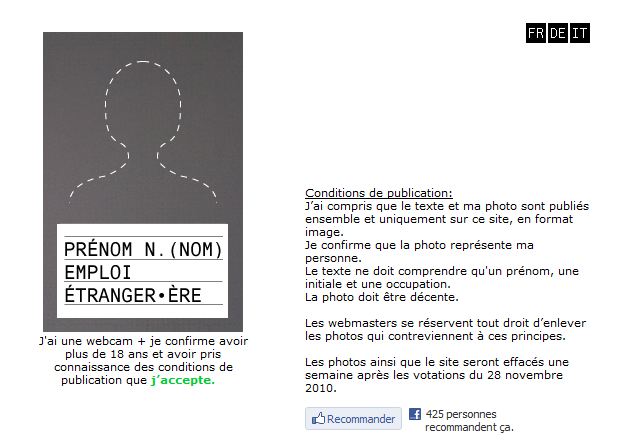 “Ce manifeste est un acte de solidarité et de protestation : solidarité avec les « étrangers et les étrangères » encore une fois pointé·e·s du doigt et protestation contre une justice discriminatoire qui serait inscrite dans la Constitution. Parce que le racisme doit être combattu partout et non pas institutionnalisé, nous placardons nos prénoms, nos initiales, nos occupations et nous clamons notre refus de cette discrimination en nous déclarant tou·te·s étranger·ère·s. Parce que nous souhaitons offrir une visibilité aux «étranger·ère·s» qui ne sont pas criminel·le·s et qui participent à l’essor de la Suisse. Action citoyenne collective, dimanche 28 novembre, NON à l’initiative sur le renvoi et au contre-projet.”