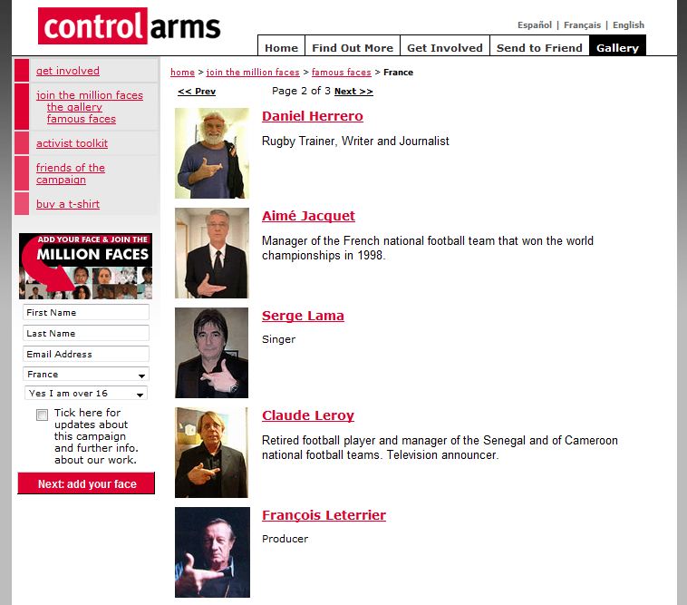 Si l’esprit reste, l’effet est autrement saisissant : à l’heure où j’écris ces lignes, il y a plus de 1.000 visages qui s’affichent sur le site, de tous horizons, et de tous âges. Cependant, rien de très original là dedans, il existe bien d’autre exemples de pétition visuelle sur le Net, dont une assez célèbre, “the Million Faces” disponible sur le site de Control Arms dont le combat est décrit ainsi :