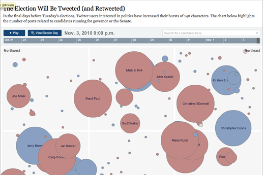 Outre cette approche plutôt théorique, les chiffres et les différentes actions parlent d’eux-mêmes. Aux États-Unis toujours, le 3ème débat télévisé en 2010 a généré 154.342 tweets relatifs à différents termes proches du débat sur Twitter, soit près de 27 tweets par seconde, par 33.095 individus, selon le compte Twitter officiel @Tweetminster. Sur Facebook, des groupes pro-Républicains ont rassemblé jusqu’à 136.000 personnes, jusqu’à 126.000 pour les pro-Démocrates. The Washington Post a acheté la tendance de recherche promotionnelle « #Elections », le New York Times a créé une cartographie [en] affichant le tracking des discussions au sujet des différents prétendants, Twitter a appelé à l’utilisation des hashtags #Votereport et #NYCvotes, Foursquare a créé le badge « I voted », une application Facebook a été spécialement conçue afin d’appeler les plus réticents à voter et Facebook a appelé au vote et proposé un outil de localisation du bureau de vote le plus proche de chez soi.