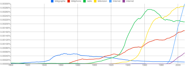Apparition et évolution de la fréquence des mots télégraphe, téléphone, radio, télévision, Internet, internet en français de 1800 à 2008. Remarquez que l’outil distingue les majuscules et minuscules (‘Internet’ apparaît plus tôt que ‘internet’ et il est plus fréquent). Pour tous les exemples illustrés de ce billet, cliquez sur le graphique correspondant afin d’afficher la requête directement dans Ngram Viewer.