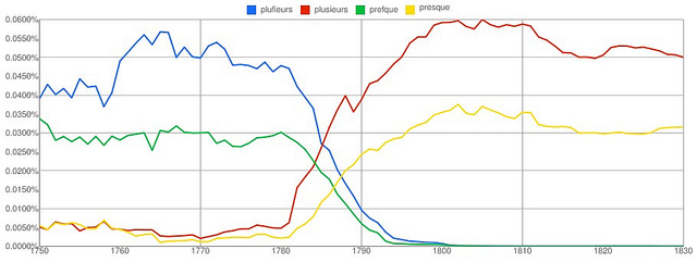 La disparition progressive du s long : plufieurs, plusieurs, prefque, presque de 1750 à 1830 (français). À noter que l'évolution du mot "plusieurs" semble anticiper celle de "presque", peut-être sous l'influence du s final du mot.