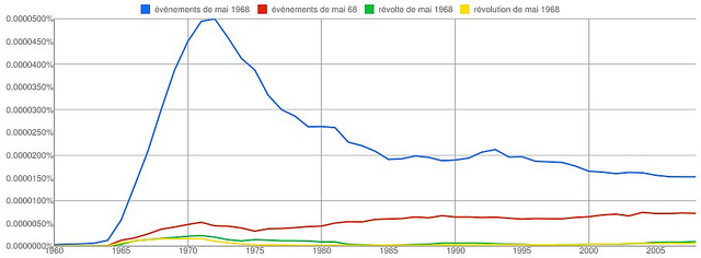 événements de mai 1968, événements de mai 68, révolte de mai 1968, révolution de mai 1968 (français, 1960-2008). Les termes 'révolte' et 'révolution' présents dans les années 70 disparaissent. La forme non abrégée '1968' devient moins fréquente tandis que la forme abrégée '68' est légèrement plus présente.