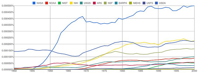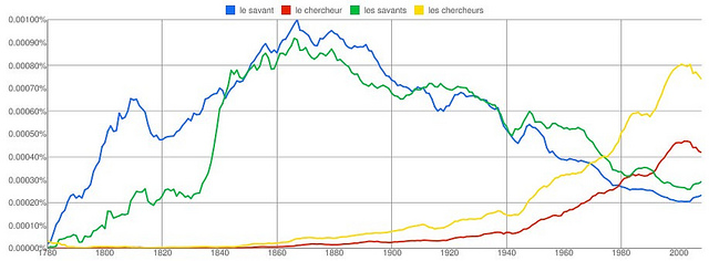 Ngram Viewer [en] est un nouvel outil mis en ligne par Google le 16 décembre dernier [en]. Il permet de visualiser sous forme de graphiques les fréquences d’apparition de suites de mots dans les livres numérisés depuis 2003 sur Google Books. Ce projet a été initié en 2007 par un mathématicien et physicien américain, Erez Lieberman Aiden [en]. Il a été soutenu par Google Labs et développé par des chercheurs de Harvard, en particulier Jean-Baptiste Michel, jeune polytechnicien français.
