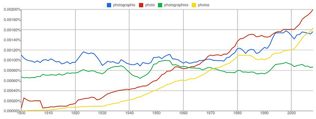 photographie, photo, photographies, photos (français, 1900-2008). Vers 1970, la forme abrégée "photo" devient plus fréquente que le mot "photographie".