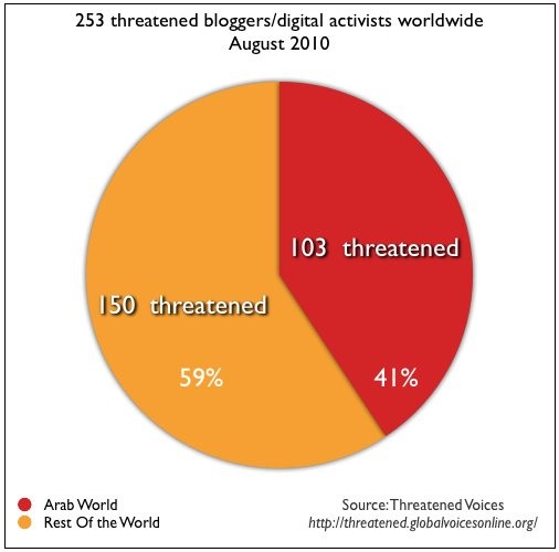 Et même si la Chine et l’Iran sont véritablement indexés sur notre plateforme des Voix Menacées, il est également clair que la région la plus répressive est celle du monde arabe, enregistrant 41% des cas de menaces envers les blogueurs et cyberactivistes. Ironiquement, la plupart des arrestations pour raisons politiques de blogueurs et de cyber-activistes ont lieu dans les pays arabes alliés aux USA.