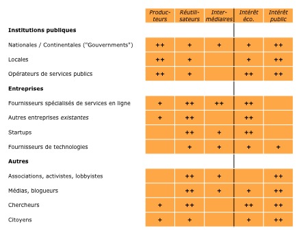 Pour commencer à identifier et à traiter ces questions, nous avons d’ailleurs intérêt à les penser à partir des acteurs : qui est concerné, qui a intérêt à la production, la circulation, la compréhension ou l’exploitation de quelles données ? Ouvertes ou non, les données n’existent pas toutes seules, elles ne circulent pas en apesanteur, mais au contraire dans un espace parcouru de courants, de champs de force, où des intérêts, des habitudes, des capacités, coopèrent ou luttent entre eux. Personne ne tire le même pouvoir des mêmes données, dans les mêmes circonstances.