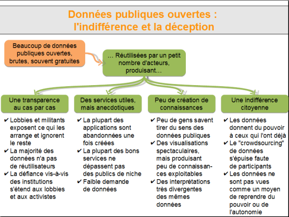 Les données publiques sont si nombreuses, complexes, hétérogènes, difficiles à interpréter, que très peu d’acteurs parviennent à réunir le courage ou les ressources pour les travailler sérieusement. Les premières applications que nous voyons aujourd’hui candidater à des concours tels qu’Apps for Democracy ou Show Us a Better Way en restent à l’état d’aujourd’hui, celui de prototypes, rarement exploitables par des citoyens ordinaires. La plupart ne se convertissent jamais en services opérationnels. De magnifiques visualisations font plus pour la célébrité de leurs concepteurs que pour créer une compréhension partagée de phénomènes complexes. Seuls quelques lobbies plongent dans les données, pour en ramener les résultats qu’ils savaient vouloir y trouver, et sans grand risque de trouver contradicteur. Après quelques contributions sur des sites comme FixMyStreet, les citoyens se fatiguent de faire le boulot qu’ils attendent de leurs municipalités, surtout quand celle-ci est plus indifférente que réactive. L’ouverture des données publiques ne fait pas beaucoup de mal, mais pas beaucoup de bien non plus.