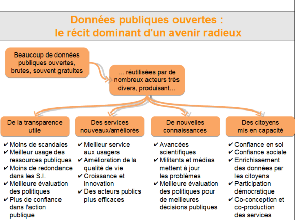 Le récit dominant de l’ouverture des données publiques décrit un avenir radieux. Des groupes de citoyens mettent à jour les abus de pouvoir, et participent de manière active à des débats publics où l’échange d’avis informés permet d’aboutir à de meilleures décisions. Ils contribuent même à enrichir le stock des données publiques, comme ils le font déjà aujourd’hui sur Open Street Map. Des grandes entreprises comme des jeunes pousses créent toutes sortes de nouveaux services et contribuent à la croissance et à la qualité de la vie. Chercheurs et “data-journalistes” passent en revue des masses de données pour enrichir la compréhension, par exemple, des changements climatiques ou des dynamiques urbaines. Les institutions publiques collaborent entre elles pour éliminer des procédures redondantes et avec les entreprises et les associations pour produire de meilleurs services publics. Nourrie par un aller et retour constant d’informations, d’évaluations et d’échanges, la démocratie trouve une nouvelle jeunesse.