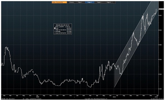 Soyons fous, entrons dans les détails. Au dernier trimestre 2010, les CDS de la Grèce ont progressé de 32% selon CMA, la dette du pays devenant dans le même temps la plus « risquée » du monde, devant le Venezuela. Les CDS de l’Irlande ont pris 35%. Un vrai succès ce plan de soutien. Tu mesures la confiance des « marchés » ? Le prochain sur la liste, le Portugal a vu ces CDS progresser de 22%. Pendant ce trimestre, la dette de l’Espagne était la septième la plus risquée. Celle de la Hongrie, la neuvième.