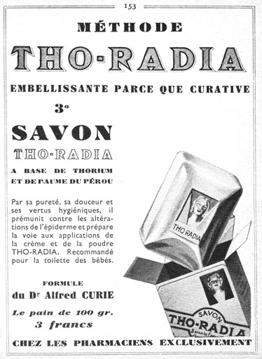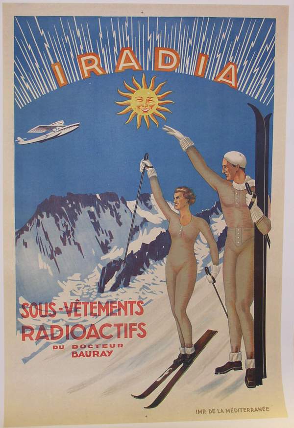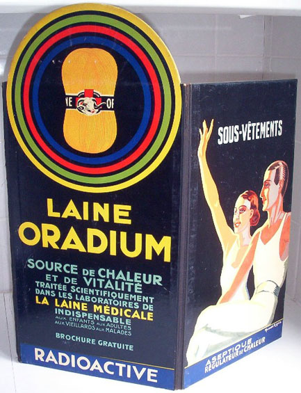 Le radium est LA substance à la mode jusque dans les années 40 : vêtements, sodas, fontaines d’eau au radon, crèmes cosmétiques, médicaments et potions supposés guérir divers maux ou booster sa vie sexuelle. La Radioactive Quackery1 bat son plein.