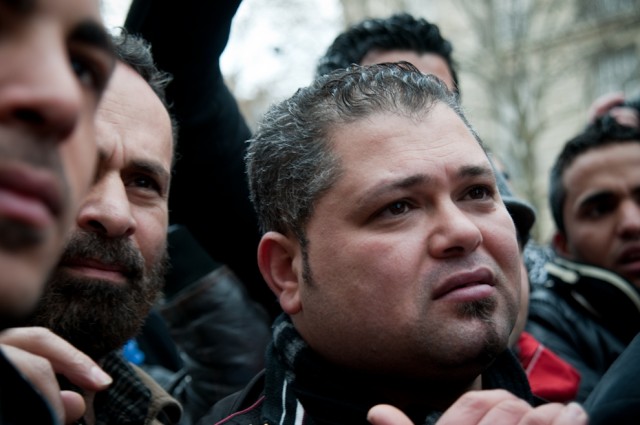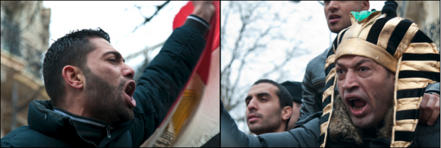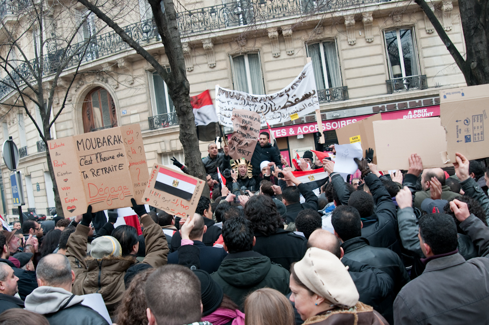 D’immenses drapeaux égyptiens sont agités par des manifestants, des drapeaux palestiniens, algériens et tunisiens déploient aussi leurs couleurs dans le froid glacé de Paris. Un groupe de jeunes Tunisiens se tient aux abords de la manifestation : pour eux, c’est un combat historique qui porte déjà ses fruits en Tunisie : “On peut enfin vivre, respirer, parler…”.