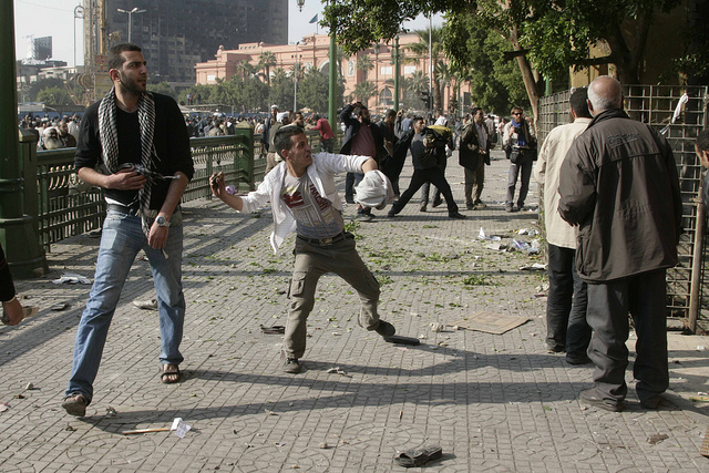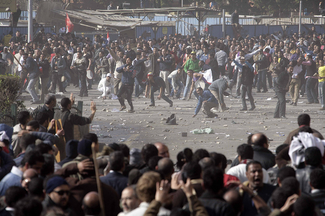 S’il y a bien une chose claire dans cette situation, c’est la distribution de la violence : elle est exclusivement du côté du régime ou de ses divers supplétifs. On hésite à émettre une opinion aussi peu nuancée, on voudrait être sûr de ne pas angéliser un mouvement de protestation qui pourrait, lui aussi, faire usage de violence. Et pourtant c’est un fait : ce sont les policiers en uniforme qui ont attaqué des manifestants pacifistes dont la réaction consistait à prier face à leurs menaces ; ce sont des policiers en civil qui, se faisant passer pour des vandales afin d’accréditer l’alternative “Moubarak ou le chaos”, ont attaqué des quartiers que leurs habitants ont décidé de défendre eux-mêmes ; ce sont aujourd’hui des policiers en civil qui, se mêlant progressivement aux manifestants de Tahrir, ont commencé à attaquer.