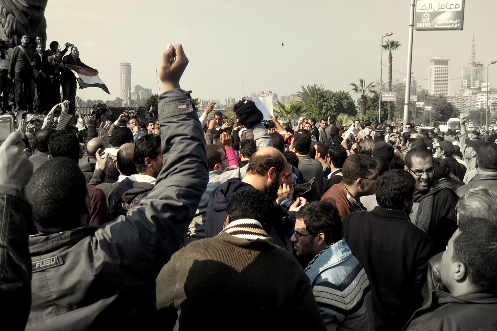 Aux abords de la place, plusieurs groupes semblent suspects, regardant de travers un étranger se rendant sur les lieux de la manifestation. On m’a dit souvent de faire attention : non pas pour ma sécurité, mais pour éviter que le mouvement apparaisse manipulé par des forces étrangères. L’arrestation d’un français par la police servirait au régime à communiquer sur l’influence étrangère. Il existe une vaste population sous-éduquée en Égypte dont l’unique source d’information consiste en la télévision nationale, avec laquelle ils ont un rapport dont l’ambiguïté ne lasse pas d’étonner : ils savent bien, évidemment, qu’elle leur ment ; mais tout de même, ils ont dit que les étrangers manipulaient les manifestants, et si c’était vrai ? Autant ne pas leur offrir sur un plateau la preuve qu’ils attendent et dont la télévision nationale ferait son beurre.